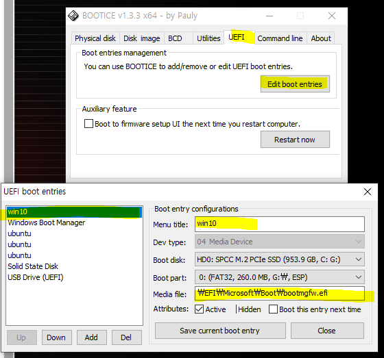 4. [UEFI] 수정 (ubuntu로 되어 있는것중 하나를 선택 해 win10-취향대로 수정하고 [Media file]을 아래와 같이 수정한 다음 (기존 윈도우것 복사) 한다음 [Up]을 이용해 최상단으로 이동해서 [save current boot entry] 후 [close]